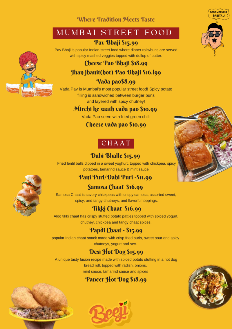 | Pao Bhaji | A spiced vegetable mash served with buttered bread rolls. |